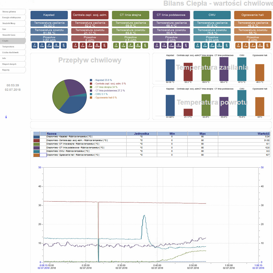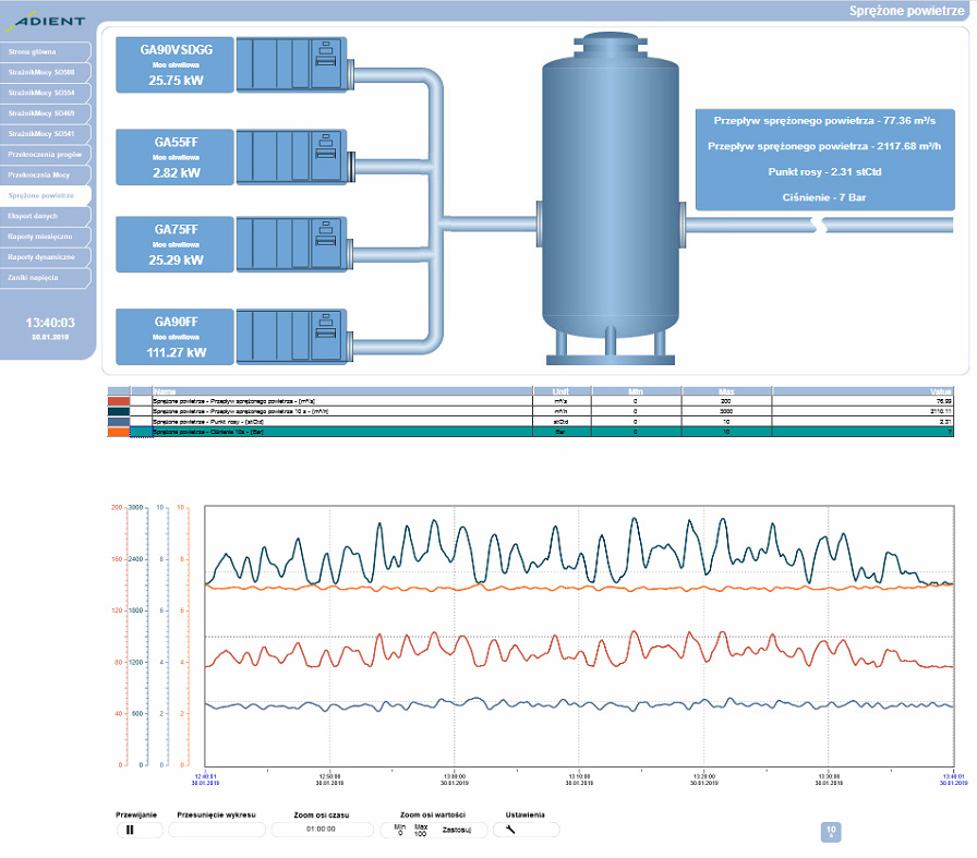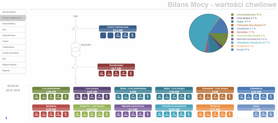 - monitoring, rejestrację, kontrolę i zarządzanie mediami takimi jak energia elektryczna, woda, gaz, sprężone powietrze, temperatura,